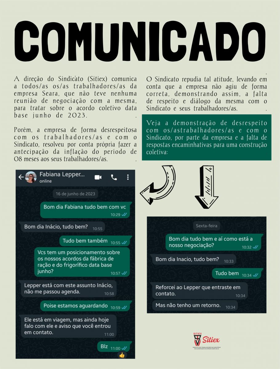 A direção do Sindicato (Sitiex) comunica a todos/as os/as trabalhadores/as da empresa Seara, que não teve nenhuma reunião de negociação com a mesma, para tratar sobre o acordo coletivo data base junho de 2023.