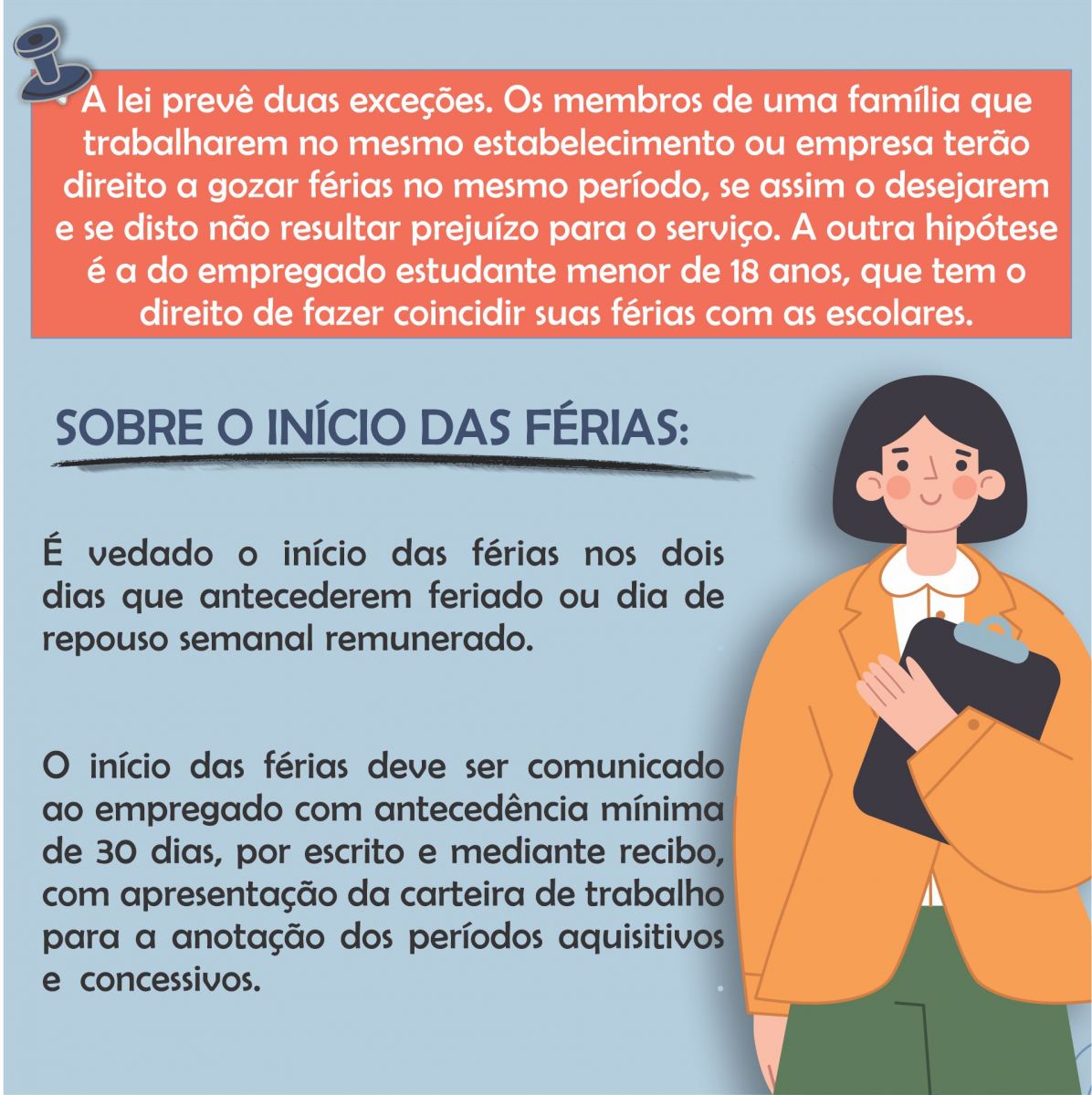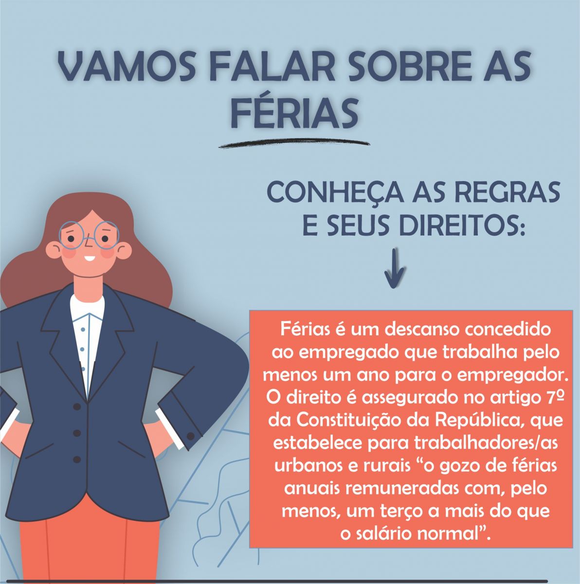Férias é um descanso concedido ao empregado que trabalha pelo menos um ano para o empregador. O direito é assegurado no artigo 7º da Constituição da República, que estabelece para trabalhadores urbanos e rurais “o gozo de férias anuais remuneradas com, pelo menos, um terço a mais do que o salário normal”.