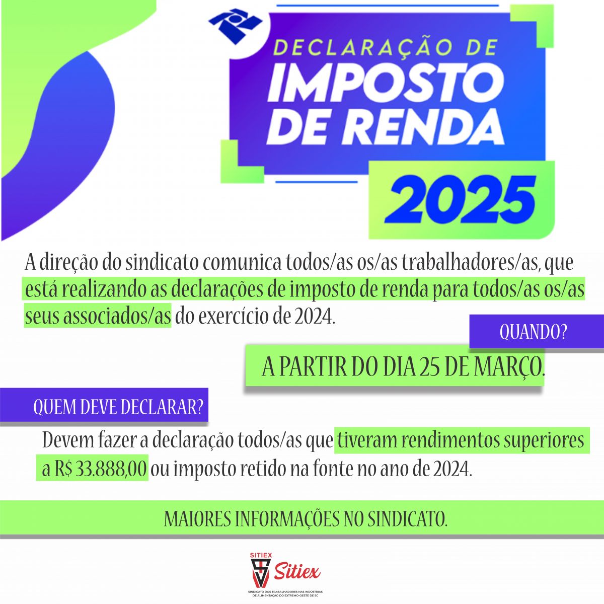 A direção do sindicato comunica todos/as os/as trabalhadores/as, que está realizando as declarações de imposto de renda para todos/as os/as seus associados/as do exercício de 2024, a partir do dia 25 de março. Devem fazer a declaração todos/as que tiveram rendimentos superiores a R$ 33.888,00 ou imposto retido na fonte no ano de 2024.