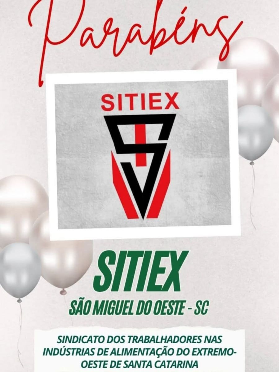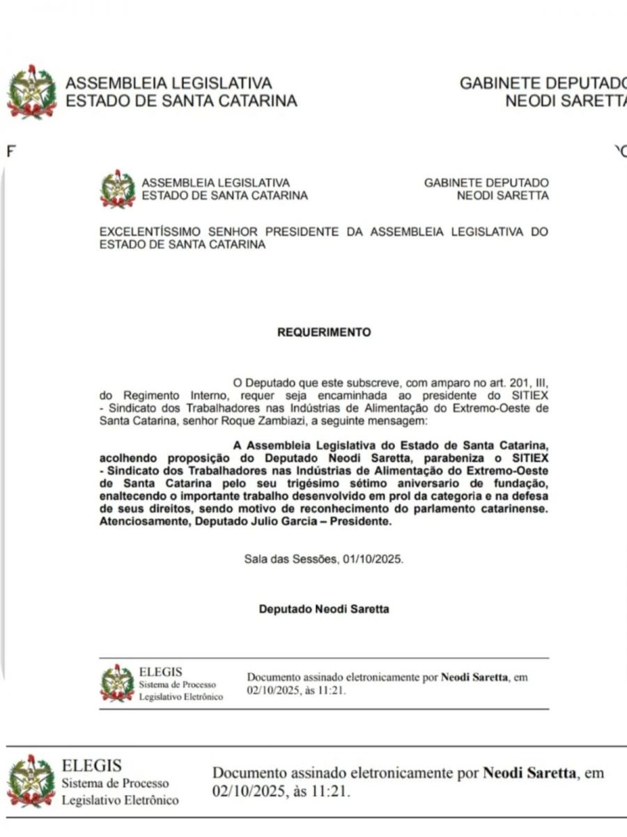A Assembleia Legislativa do Estado de Santa Catarina, acolhendo proposição do Deputado Neodi Saretta, parabeniza o SITIEX-Sindicato dos Trabalhadores nas Indústrias de Alimentação do Extremo-Oeste de Santa Catarina pelo seu trigésimo sétimo aniversario em 30 de setembro de 2025.
