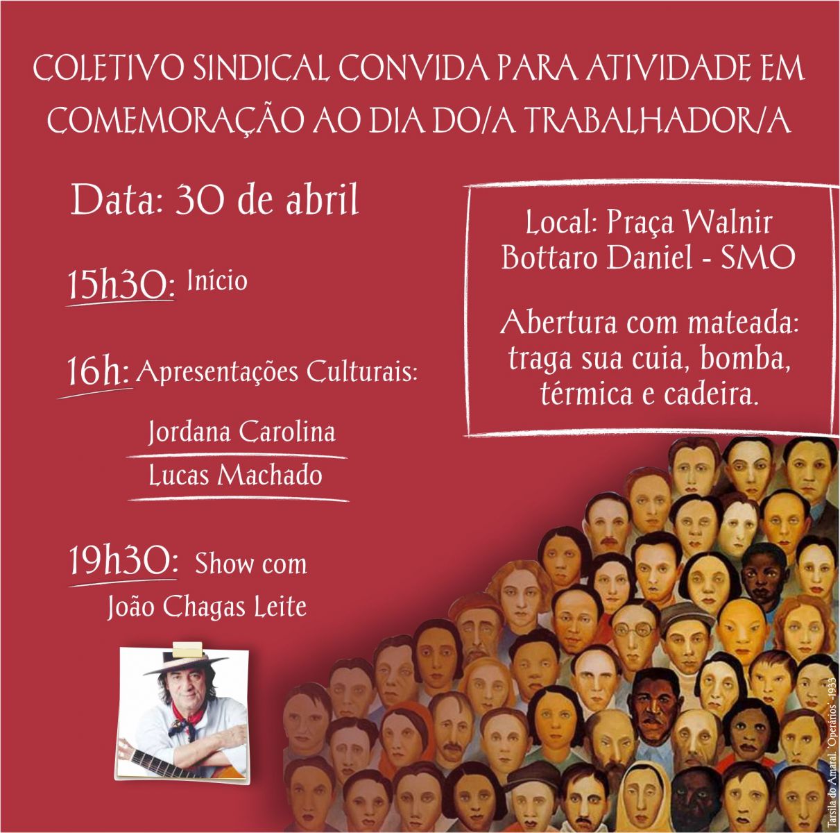 O coletivo sindical de São Miguel do Oeste preparou para o dia 30 de abril, no domingo, uma atividade cultural para homenagear as trabalhadoras e os trabalhadores. Confira no cartaz os detalhes dessa atividade e venha participar com a gente.