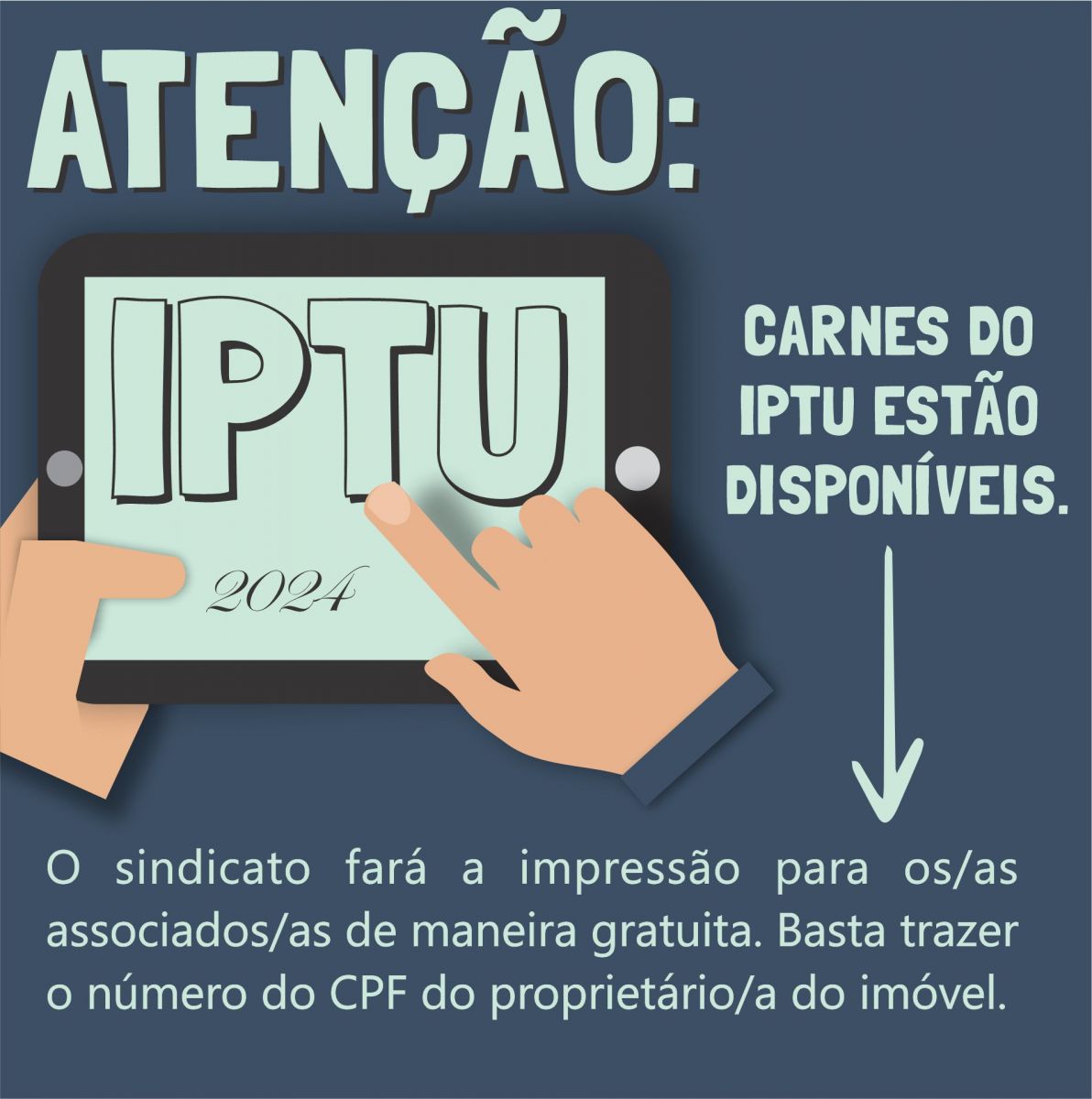 O sindicato oferece o serviço de impressão do seu carnê do IPTU. Não deixe passar os prazos. Fique atento/a.